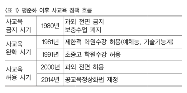 사교육 정책의 흐름만으로 본다면 1980년대는 사교육 금지 시기로서 규제 중심의 정책이 1990년대에 일부 완화기를 거쳐 2000년대에 전면 허용의 과정을 거쳤다. 사교육의 문제에 억제와 금지보다는 공교육을 정상화하여 자연스럽게 사교육이 불필요하도록 하는 입장으로 선회한 것이다. 명목상으로는 공교육의 정상화를 통해 사교육 문제를 해결한다는 것은 긍정적인 개선책으로 보인다. 그러나 공교육의 ‘정상화’가 과연 무엇을 의미하는지, 그것의 결과가 무엇인지, 누가 그것을 원하는지 분명하지 않다. 공교육이 정상화된다고 해서 교육의 문제가 완전히 해결된다거나, 다양한 교육적 수요를 완벽하게 충족시켜 줄 수 없는 것만은 분명하다. 공교육의 실체나 주체가 있는 것인지도 혼란스럽다. 사교육 금지-완화-허용의 시뮬레이션을 모두 거쳤어도 어떠한 정책이 적절하고 효과적인지 알 수 없는 것이 현실이다.