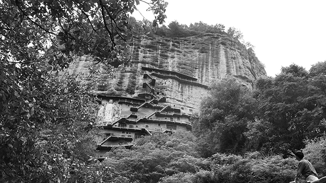 이튿날 우리가 방문한 곳은 천수 인근의 맥적산(麥積山) 석굴. 유네스코 세계문화유산에 등록된 둔황석굴, 용문석굴, 운강석굴과 함께 중국의 4대 석굴이다. 4대 석굴 중 가장 보존이 잘 되어 있다고 한다. 맥적산의 이름은 산봉우리의 모양에서 따왔다. 하부가 좁고 정상 부분이 더 넓은 모양새가 마치 보릿단을 쌓아놓은 것처럼 보인다고 하여 붙여진 이름이다.