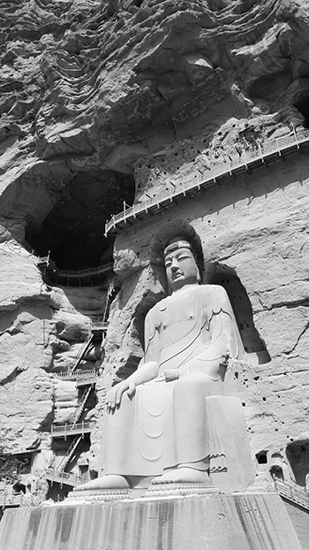 절벽 60m 위에 만들어진 169번 굴 안에 있는 무량수불은 오호십육국 시대(4~5세기) 중국인들의 서방극락정토 신앙을 엿볼 수 있다. 황하에 도열한 기암괴석은 그 수려한 자태에 눈을 떼기 어려웠다. 신선이 되기 위한 사람들이 이곳에 들어와 벽화와 석굴을 만들며 살았던가. 야자나무 아래 부처가 평화롭게 앉아 있기도 하고 벽화의 채색과 불상의 자연스럽게 흘러내리는 옷자락과 채색이 그대로 살아 있어 놀랍기만 했다.