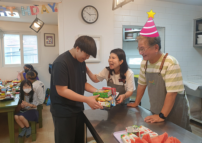 간식을 선물받고 기뻐하는 아이들 모습이 좋습니다.