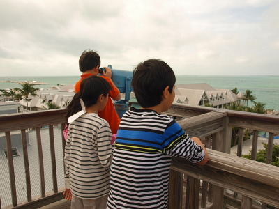 난파선 박물관 전망대에서 키웨스트 북쪽 바다를 보고 있는 아이들