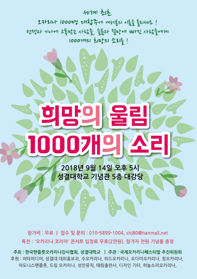 2018 국제 오카리나 페스티발 -희망의 울림. 천개의 소리- 작성자박스텔라|작성시간18.08.07|조회수41 목록 댓글 0 글자크기 작게가 글자크기 크게가 2018. 국제 오카리나 페스티발 다음검색 현재 게시글 추가 기능 열기 북마크 공유하기 신고 센터로 신고 댓글 댓글 0 댓글쓰기 답글쓰기 댓글 리스트