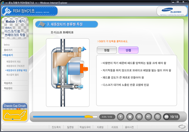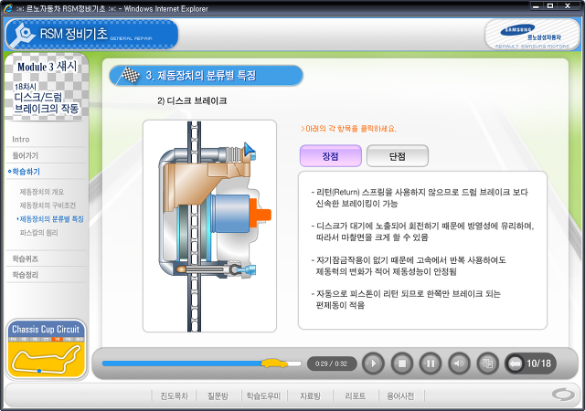 바퀴와 함께 회전하는 디스크를 양쪽에서 브레이크 패드를 유압으로 밀착시켜 제동력을 얻는 방법을 이용한다. 디스크 브레이크 (Disk Brake)는 휠 허브 (Wheel Hub)와 함께 회전하는 디스크, 패드 그리고 피스톤이 들어있는 캘리퍼등으로 구성되어 있다.