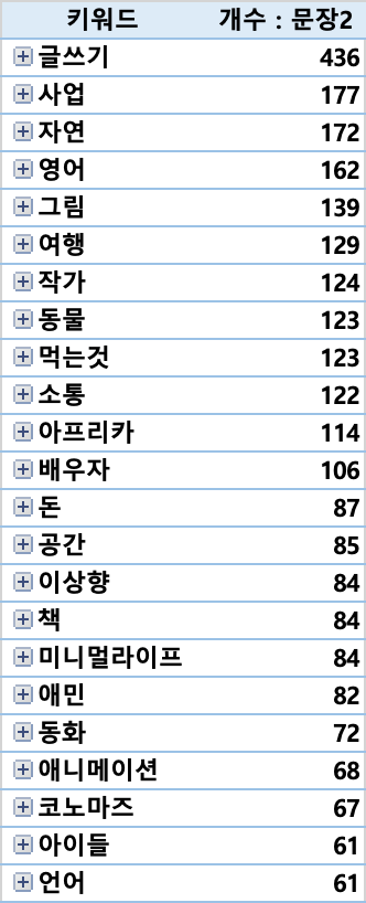 글과 관련 된 키워드(글쓰기,작가,소통,책,애민,동화,아이들,언어) 1042문장이 나왔습니다. 자연, 그림, 여행, 동물, 아프리카 등등 100개가 넘는 키워드들은 제가 쓴 스토리 속에서 얼마든지 구현될 수 있고, 간접경험을 할 수 있는 배경과 소재가 될 수 있는 것들이라는 것을 알게 되었습니다.
