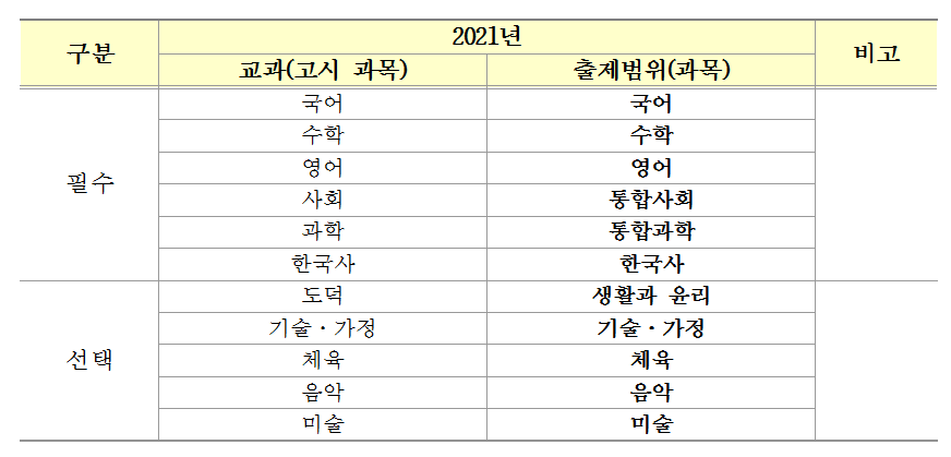 ⇒ 2015 개정 고등학교 교육과정의 각 교과에 포함되어 있는 필수 및 선택의 다양한 과목 중 검정고시의 출제 범위에