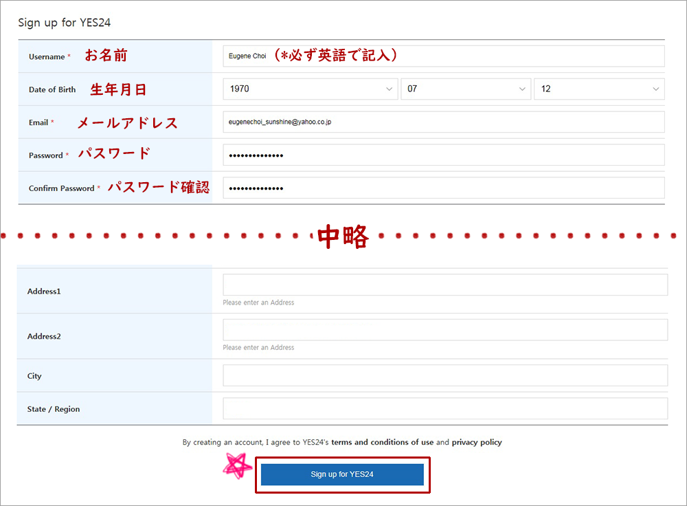 2. 「Sign up for YES24」を記入してください。一番下の青いボタン(Sign up for YES24)を押してください。Shipping Addressは記入しなくても構いません。