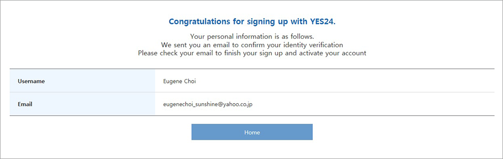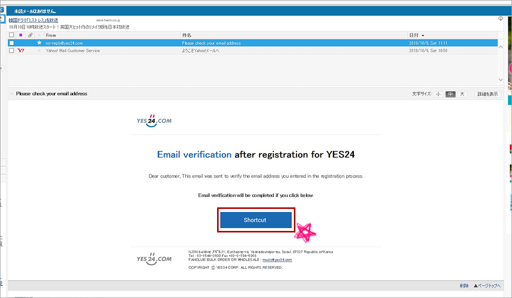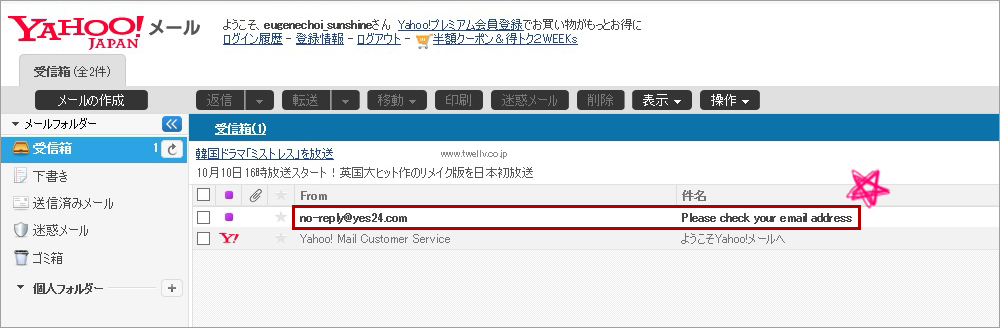 4. 登録したお客様のメールアドレスまでYES24からPlease check your email addressというタイトルのメールが届いたのかご確認してください。登録の際お客様がメールアドレスを正しく記入していたか確認するために送られたメールです。もし届いてなかったら、最初からもう一度お願いします。