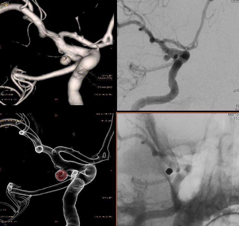 여러개의 코일이 채워지고 더이상 빈 공간이 보이지 않아 뇌혈관조영술로 확인한 결과 뇌동맥류는 보이지 않고 그곳에 코일로 가득 채워져 있어 더이상 뇌동맥류쪽으로 혈류가 흐르지 않는 것을 확인하시고 시술을 종료하십니다![]()