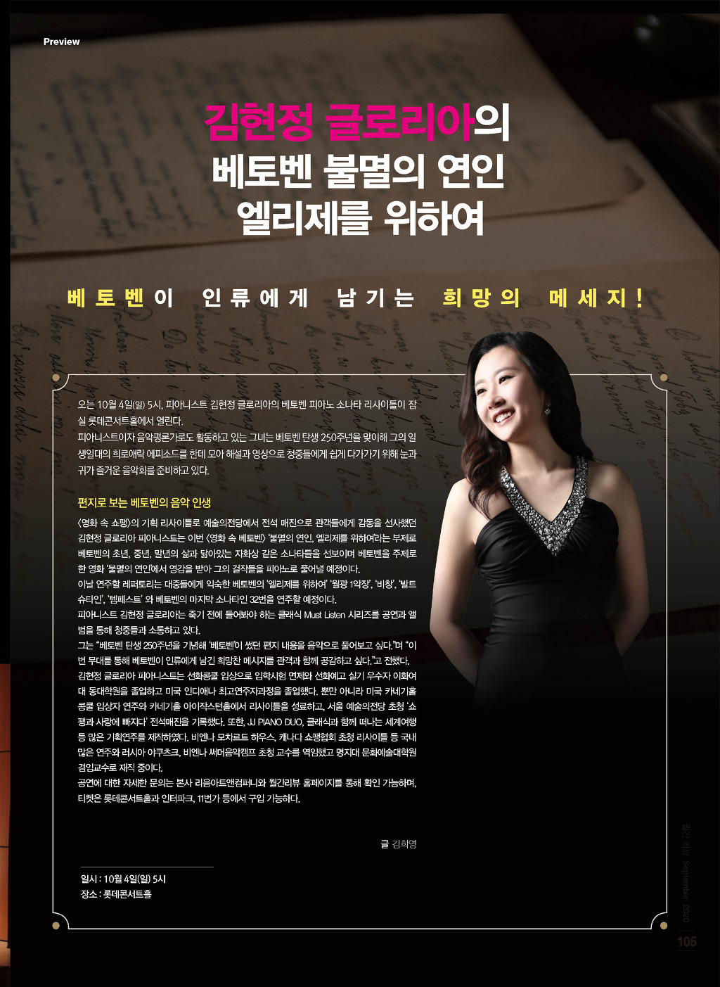 [10.4 일 5시] 롯데콘서트홀 피아니스트 김현정 글로리아 베토벤 불멸의 연인,엘리제를위하여 작성자김현정피아노|작성시간20.09.13|조회수13 목록 댓글 0 글자크기 작게가 글자크기 크게가 다음검색 현재 게시글 추가 기능 열기 북마크 공유하기 신고 센터로 신고 댓글 댓글 0 댓글쓰기 답글쓰기 댓글 리스트