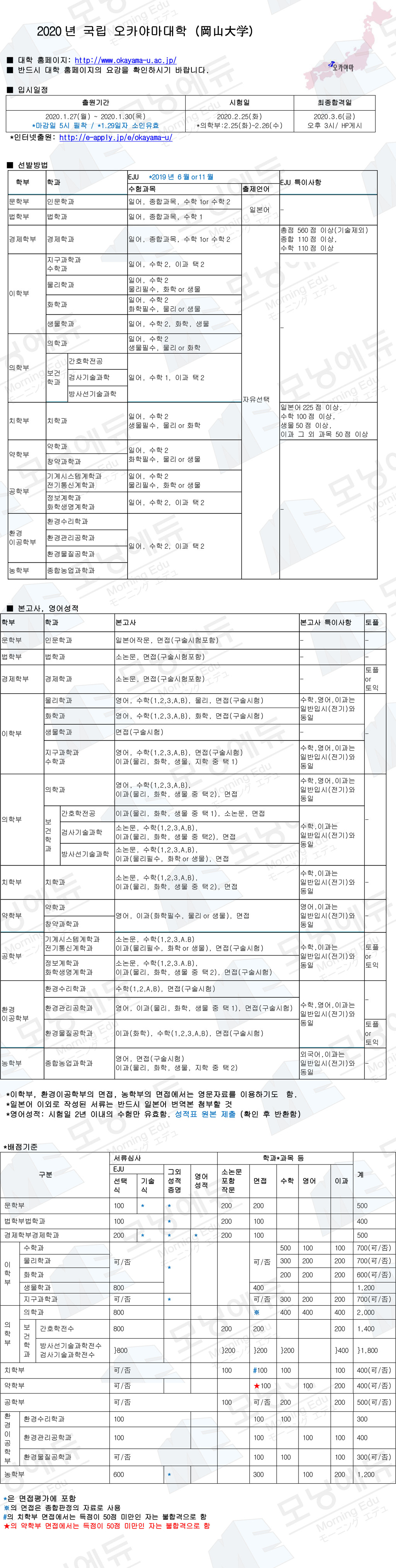 <국립> 2020년도 오카야마대학(岡山大学) 작성자모닝에듀(주)|작성시간19.10.26|조회수1,557 목록 댓글 0 글자크기 작게가 글자크기 크게가 2020년 오카야마대학 사비유학생 모집요강.pdf 첨부파일첨부된 파일이 2개 있습니다. pdf 파일 2020년 오카야마대학 사비유학생 모집요강.pdf 다운로드 jpg 파일 2020 오카야마대학-1 copy.jpg 다운로드 다음검색 현재 게시글 추가 기능 열기 북마크 신고 센터로 신고 댓글 댓글 0 댓글쓰기 답글쓰기 댓글 리스트