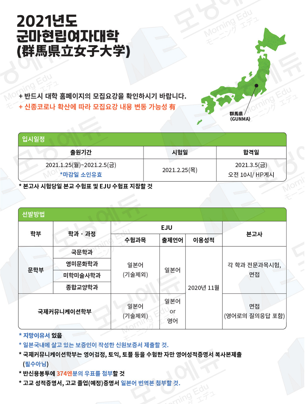 <공립> 2021년도 군마현립여자대학(群馬県立女子大学) 작성자모닝에듀(주)|작성시간20.12.10|조회수176 목록 댓글 0 글자크기 작게가 글자크기 크게가 ▶학교홈페이지: https://www.gpwu.ac.jp/ 2021 군마현립여자대학 사비외국인유학생 모집요강.pdf 첨부파일첨부된 파일이 2개 있습니다. jpg 파일 2021 군마여자대학.jpg 다운로드 pdf 파일 2021 군마현립여자대학 사비외국인유학생 모집요강.pdf 다운로드 다음검색 현재 게시글 추가 기능 열기 북마크 신고 센터로 신고 댓글 댓글 0 댓글쓰기 답글쓰기 댓글 리스트
