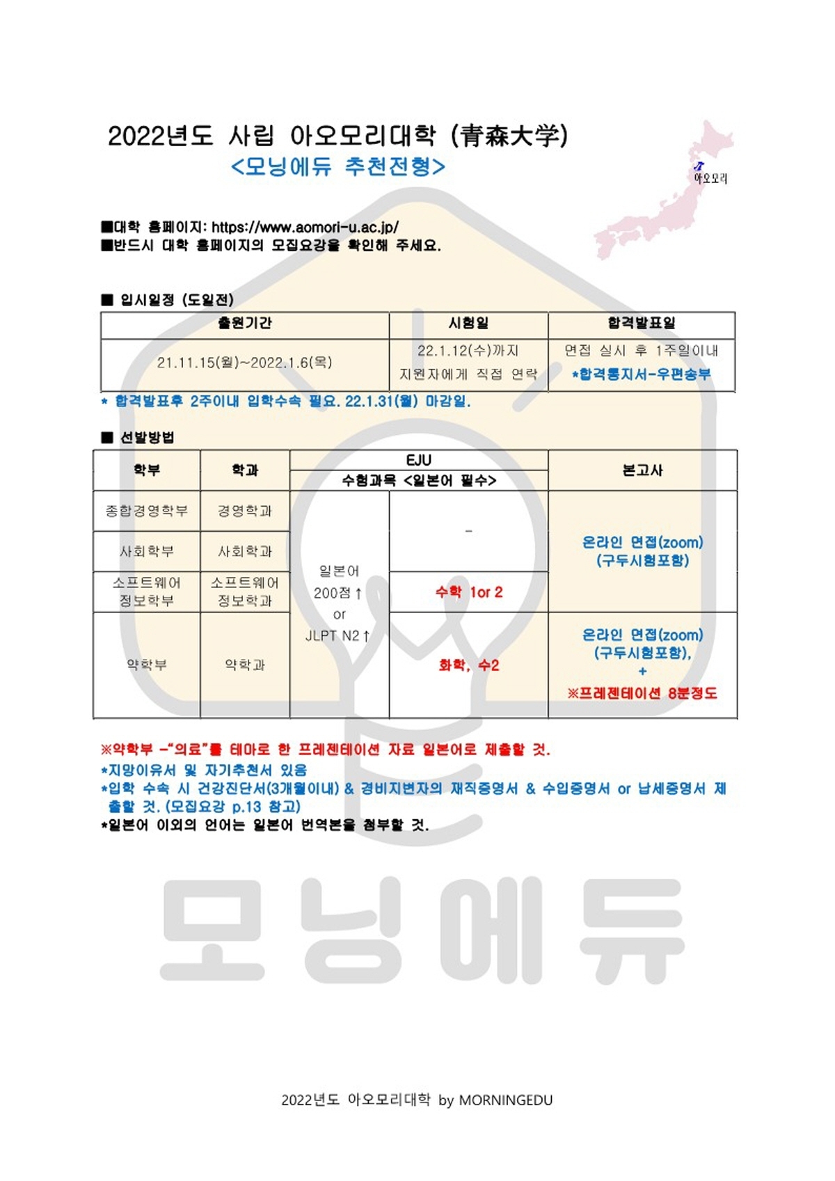 <사립> 2022년도 아오모리대학 (青森大学) 작성자모닝에듀(주)|작성시간21.10.12|조회수880 목록 댓글 0 글자크기 작게가 글자크기 크게가 2022 아오모리대학 외국인유학생 도일전 경비지변서.pdf158.40KB2022 아오모리대학 외국인유학생 도일전 모집요강.pdf16.17MB2022 아오모리대학 외국인유학생 도일전 원서.pdf167.43KB2022 아오모리대학 외국인유학생 도일전 지망이유서, 자기추천서.pdf83.70KB2022 아오모리대학 외국인유학생 도일전 출원조서.pdf158.52KB 첨부파일첨부된 파일이 6개 있습니다. pdf 파일 2022 아오모리대학 외국인유학생 도일전 경비지변서.pdf 다운로드 pdf 파일 2022 아오모리대학 외국인유학생 도일전 지망이유서, 자기추천서.pdf 다운로드 pdf 파일 2022 아오모리대학 외국인유학생 도일전 출원조서.pdf 다운로드 pdf 파일 2022 아오모리대학 외국인유학생 도일전 원서.pdf 다운로드 pdf 파일 2022 아오모리대학 외국인유학생 도일전 모집요강.pdf 다운로드 jpg 파일 [크기변환]2022 아오모리대학(추천입학)_1.jpg 다운로드 다음검색 현재 게시글 추가 기능 열기 북마크 신고 센터로 신고 댓글 댓글 0 댓글쓰기 답글쓰기 댓글 리스트