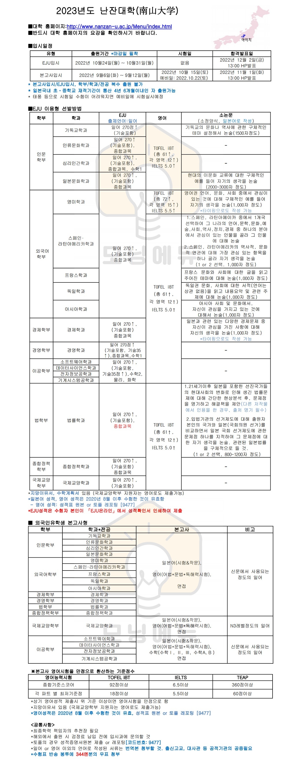 <사립> 2023년도 난잔대학 (南山大学) 작성자모닝에듀(주)|작성시간22.05.19|조회수206 목록 댓글 0 글자크기 작게가 글자크기 크게가 2023 난잔 외국인유학생입시 모집요강.pdf2.95MB2023 난잔 외국인유학생입시 소정양식.pdf7.11MB2023 난잔 외국인유학생입시 지망이유서 (EJU이용전형).docx17.69KB2023 난잔 외국인유학생입시 지망이유서 (본고사전형).doc45.00KB2023 난잔 외국인유학생입시 지원자조서 기입예.pdf362.38KB 첨부파일첨부된 파일이 6개 있습니다. docx 파일 2023 난잔 외국인유학생입시 지망이유서 (EJU이용전형).docx 다운로드 doc 파일 2023 난잔 외국인유학생입시 지망이유서 (본고사전형).doc 다운로드 pdf 파일 2023 난잔 외국인유학생입시 지원자조서 기입예.pdf 다운로드 pdf 파일 2023 난잔 외국인유학생입시 모집요강.pdf 다운로드 pdf 파일 2023 난잔 외국인유학생입시 소정양식.pdf 다운로드 jpg 파일 2023 난잔.jpg 다운로드 다음검색 현재 게시글 추가 기능 열기 북마크 신고 센터로 신고 댓글 댓글 0 댓글쓰기 답글쓰기 댓글 리스트