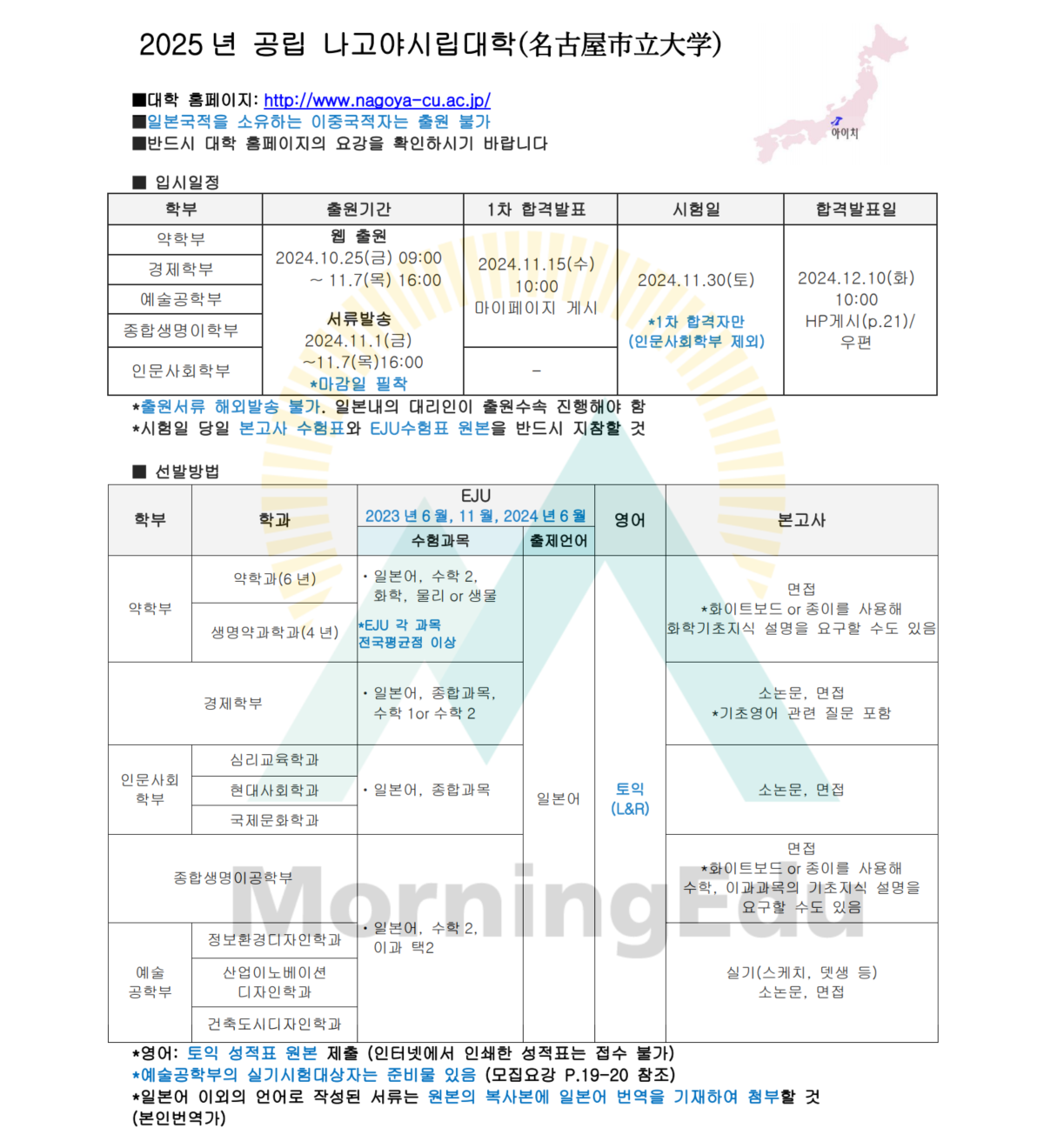 <공립> 2025년도 나고야시립대학(名古屋市立大学) 작성자모닝에듀(주)|작성시간24.08.15|조회수2,295 목록 댓글 0 글자크기 작게가 글자크기 크게가 2025 나고야시립 외국인유학생 모집요강 - 20240712.pdf968.43KB2025 나고야시립 외국인유학생 이력서 - 20240712.pdf53.96KB2025 나고야시립 외국인유학생 이력서 기입 예시 - 20240712.pdf94.15KB 첨부파일첨부된 파일이 4개 있습니다. png 파일 2025 나고야시립대학.png 다운로드 pdf 파일 2025 나고야시립 외국인유학생 모집요강 - 20240712.pdf 다운로드 pdf 파일 2025 나고야시립 외국인유학생 이력서 - 20240712.pdf 다운로드 pdf 파일 2025 나고야시립 외국인유학생 이력서 기입 예시 - 20240712.pdf 다운로드 다음검색 현재 게시글 추가 기능 열기 북마크 신고 센터로 신고 댓글 댓글 0 댓글쓰기 답글쓰기 댓글 리스트