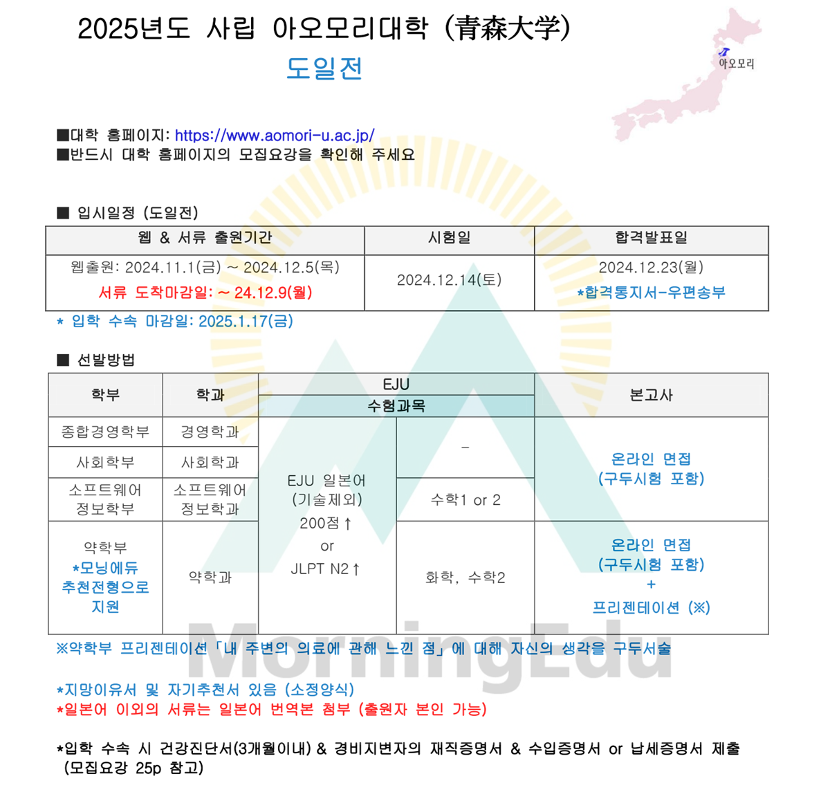 <사립> 2025년도 아오모리대학 (青森大学) 도일전 작성자모닝에듀(주)|작성시간24.09.19|조회수117 목록 댓글 0 글자크기 작게가 글자크기 크게가 2025 아오모리 외국인유학생 경비지변서(도일전) - 20240813.pdf105.90KB2025 아오모리 외국인유학생 도일전 모집요강 - 20240727.pdf96.02KB2025 아오모리 외국인유학생 모집요강 - 20240702.pdf1.17MB2025 아오모리 외국인유학생 지망이유서・자기추천서 - 20240813.docx30.37KB2025 아오모리 외국인유학생 지망이유서・자기추천서 - 20240813.pdf88.62KB2025 아오모리 외국인유학생 출원조서 - 20240813.pdf120.52KB 첨부파일첨부된 파일이 7개 있습니다. png 파일 2025 아오모리대학.png 다운로드 pdf 파일 2025 아오모리 외국인유학생 경비지변서(도일전) - 20240813.pdf 다운로드 pdf 파일 2025 아오모리 외국인유학생 도일전 모집요강 - 20240727.pdf 다운로드 docx 파일 2025 아오모리 외국인유학생 지망이유서・자기추천서 - 20240813.docx 다운로드 pdf 파일 2025 아오모리 외국인유학생 모집요강 - 20240702.pdf 다운로드 pdf 파일 2025 아오모리 외국인유학생 출원조서 - 20240813.pdf 다운로드 pdf 파일 2025 아오모리 외국인유학생 지망이유서・자기추천서 - 20240813.pdf 다운로드 다음검색 현재 게시글 추가 기능 열기 북마크 신고 센터로 신고 댓글 댓글 0 댓글쓰기 답글쓰기 댓글 리스트