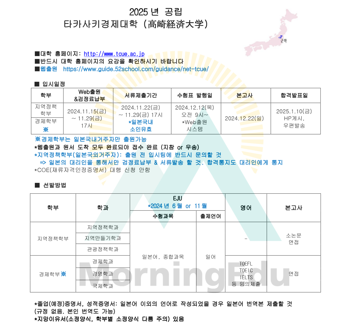 <공립> 2025년도 타카사키경제대학(高崎経済大学) 작성자모닝에듀(주)|작성시간24.09.20|조회수449 목록 댓글 0 글자크기 작게가 글자크기 크게가 2025 타카사키경제 외국인유학생 지역정책학부 모집요강 - 20240713.pdf697.13KB2025 타카사키경제 외국인유학생 지역정책학부 지망이유서 - 20240713.pdf27.71KB 첨부파일첨부된 파일이 3개 있습니다. png 파일 2025 타카사키경제대학.png 다운로드 pdf 파일 2025 타카사키경제 외국인유학생 지역정책학부 지망이유서 - 20240713.pdf 다운로드 pdf 파일 2025 타카사키경제 외국인유학생 지역정책학부 모집요강 - 20240713.pdf 다운로드 다음검색 현재 게시글 추가 기능 열기 북마크 신고 센터로 신고 댓글 댓글 0 댓글쓰기 답글쓰기 댓글 리스트