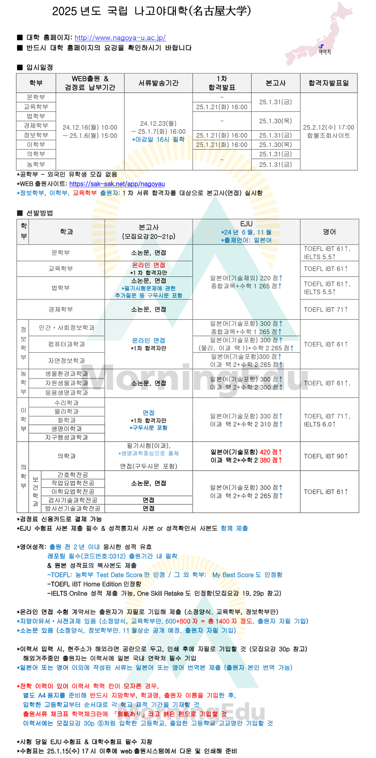 <국립> 2025년도 나고야대학(名古屋大学) 작성자모닝에듀(주)|작성시간24.10.18|조회수766 목록 댓글 0 글자크기 작게가 글자크기 크게가 2025 나고야 외국인유학생 정보학부 소논문 - 20241018.pdf594.03KB2025 나고야 외국인유학생 교육학부 온라인면접수험계약서 - 20241003.pdf271.87KB2025 나고야 외국인유학생 교육학부 지망이유,특별과제 - 20241003.pdf72.08KB2025 나고야 외국인유학생 모집요강 - 20241003.pdf2.43MB2025 나고야 외국인유학생 이력서(타이핑) - 20241003.pdf100.46KB2025 나고야 외국인유학생 정보학부 소논문 - 20241018.pdf594.03KB2025 나고야 외국인유학생 정보학부 온라인면접수험계약서 - 20241003.pdf271.87KB 첨부파일첨부된 파일이 8개 있습니다. png 파일 나아고야업로드.png 다운로드 pdf 파일 2025 나고야 외국인유학생 교육학부 온라인면접수험계약서 - 20241003.pdf 다운로드 pdf 파일 2025 나고야 외국인유학생 교육학부 지망이유,특별과제 - 20241003.pdf 다운로드 pdf 파일 2025 나고야 외국인유학생 이력서(타이핑) - 20241003.pdf 다운로드 pdf 파일 2025 나고야 외국인유학생 정보학부 소논문 - 20241018.pdf 다운로드 pdf 파일 2025 나고야 외국인유학생 정보학부 온라인면접수험계약서 - 20241003.pdf 다운로드 pdf 파일 2025 나고야 외국인유학생 모집요강 - 20241003.pdf 다운로드 pdf 파일 2025 나고야 외국인유학생 정보학부 소논문 - 20241018.pdf 다운로드 다음검색 현재 게시글 추가 기능 열기 북마크 신고 센터로 신고 댓글 댓글 0 댓글쓰기 답글쓰기 댓글 리스트