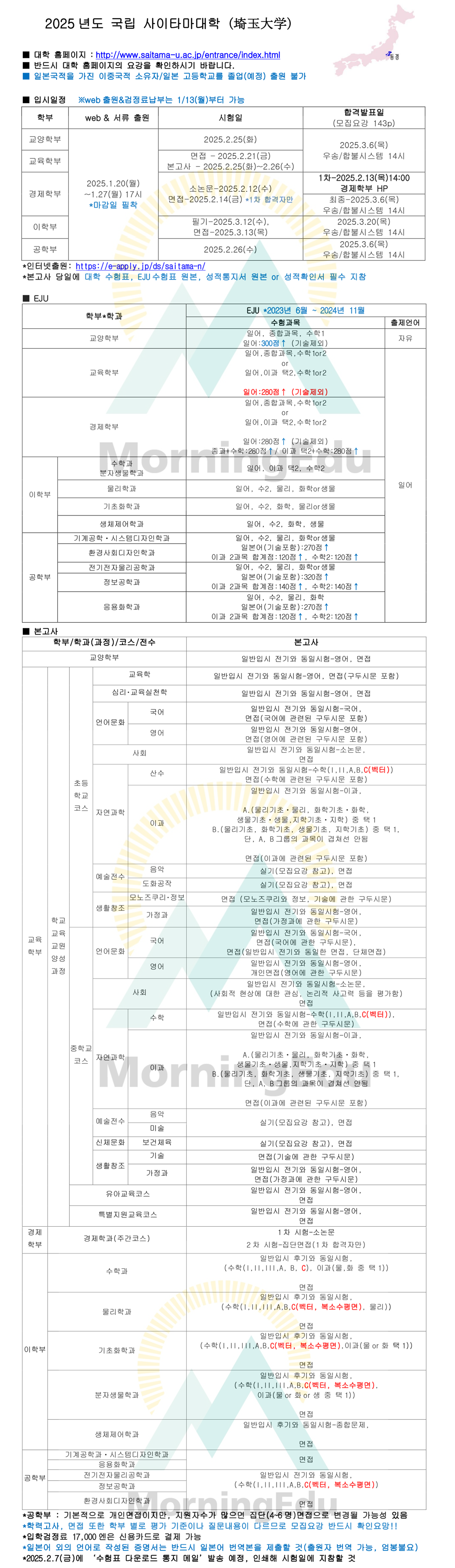 <국립> 2025년도 사이타마대학(埼玉大学) 작성자모닝에듀(주)|작성시간24.11.14|조회수1,378 목록 댓글 0 글자크기 작게가 글자크기 크게가 2025 사이타마 외국인유학생 모집요강(전일정 선발에서 발췌) - 241103.pdf4.24MB2025 사이타마 외국인유학생 특별선발 이력 등 기입 시트(사비외국인유학생선발용) - 241103.pdf155.36KB2025 사이타마 전일정 선발 모집요강 - 241114.pdf7.98MB 첨부파일첨부된 파일이 4개 있습니다. pdf 파일 2025 사이타마 전일정 선발 모집요강 - 241114.pdf 다운로드 pdf 파일 2025 사이타마 외국인유학생 모집요강(전일정 선발에서 발췌) - 241103.pdf 다운로드 pdf 파일 2025 사이타마 외국인유학생 특별선발 이력 등 기입 시트(사비외국인유학생선발용) - 241103.pdf 다운로드 png 파일 2025 사이타마.png 다운로드 다음검색 현재 게시글 추가 기능 열기 북마크 신고 센터로 신고 댓글 댓글 0 댓글쓰기 답글쓰기 댓글 리스트