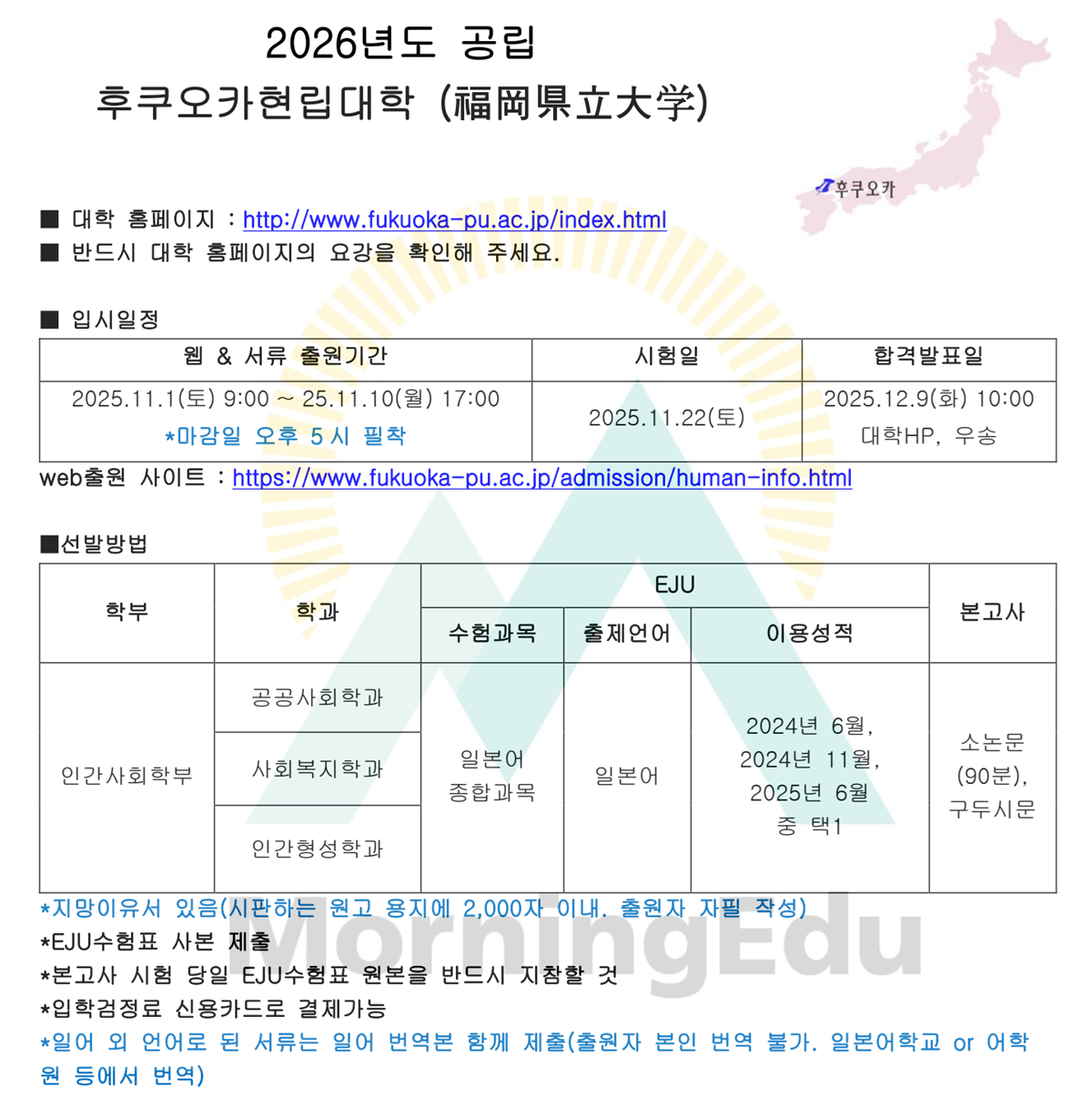 <공립> 2026년도 후쿠오카현립대학(福岡県立大学) 작성자모닝에듀(주)|작성시간25.07.08|조회수370 목록 댓글 0 글자크기 작게가 글자크기 크게가 2026 후쿠오카현립 모집요강 - 20250703.pdf1.89MB 첨부파일첨부된 파일이 2개 있습니다. png 파일 2026 후쿠오카현립대학.png 다운로드 pdf 파일 2026 후쿠오카현립 모집요강 - 20250703.pdf 다운로드 다음검색 현재 게시글 추가 기능 열기 북마크 신고 센터로 신고 댓글 댓글 0 댓글쓰기 답글쓰기 댓글 리스트