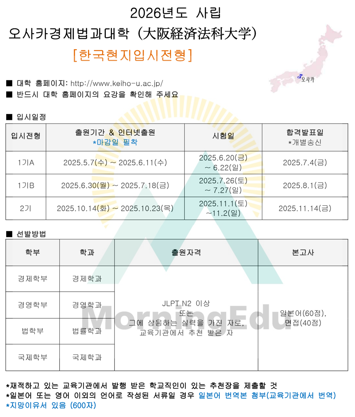 <사립> 2026년도 오사카경제법과대학 (大阪経済法科大学) 한국현지입시전형 작성자모닝에듀(주)|작성시간25.09.15|조회수172 목록 댓글 0 글자크기 작게가 글자크기 크게가 2026 오사카경제법과 외국인유학생 현지입시 2기 경력서 - 20250830.pdf450.81KB2026 오사카경제법과 외국인유학생 현지입시 2기 모집요강 - 20250830.pdf6.52MB2026 오사카경제법과 외국인유학생 현지입시 2기 입학지원표 - 20250830.pdf584.38KB2026 오사카경제법과 외국인유학생 현지입시 2기 지망이유서 - 20250830.pdf515.31KB2026 오사카경제법과 외국인유학생 현지입시 2기 체크리스트 - 20250830.pdf151.44KB2026 오사카경제법과 외국인유학생 현지입시 2기 추천서 - 20250830.pdf1.75MB 첨부파일첨부된 파일이 7개 있습니다. pdf 파일 2026 오사카경제법과 외국인유학생 현지입시 2기 경력서 - 20250830.pdf 다운로드 pdf 파일 2026 오사카경제법과 외국인유학생 현지입시 2기 입학지원표 - 20250830.pdf 다운로드 pdf 파일 2026 오사카경제법과 외국인유학생 현지입시 2기 지망이유서 - 20250830.pdf 다운로드 pdf 파일 2026 오사카경제법과 외국인유학생 현지입시 2기 모집요강 - 20250830.pdf 다운로드 pdf 파일 2026 오사카경제법과 외국인유학생 현지입시 2기 체크리스트 - 20250830.pdf 다운로드 pdf 파일 2026 오사카경제법과 외국인유학생 현지입시 2기 추천서 - 20250830.pdf 다운로드 png 파일 2026 오사카경제법과대학(한국현지입시전형).png 다운로드 다음검색 현재 게시글 추가 기능 열기 북마크 신고 센터로 신고 댓글 댓글 0 댓글쓰기 답글쓰기 댓글 리스트