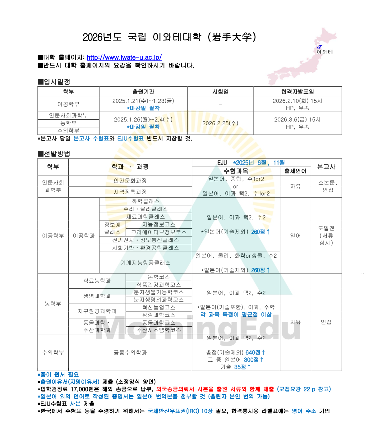 <국립> 2026년도 이와테대학(岩手大学) 작성자모닝에듀(주)|작성시간25.11.22|조회수157 목록 댓글 0 글자크기 작게가 글자크기 크게가 2026 이와테 외국인유학생 모집요강 - 20251105.pdf918.72KB 첨부파일첨부된 파일이 2개 있습니다. png 파일 2026 이와테.png 다운로드 pdf 파일 2026 이와테 외국인유학생 모집요강 - 20251105.pdf 다운로드 다음검색 현재 게시글 추가 기능 열기 북마크 신고 센터로 신고 댓글 댓글 0 댓글쓰기 답글쓰기 댓글 리스트