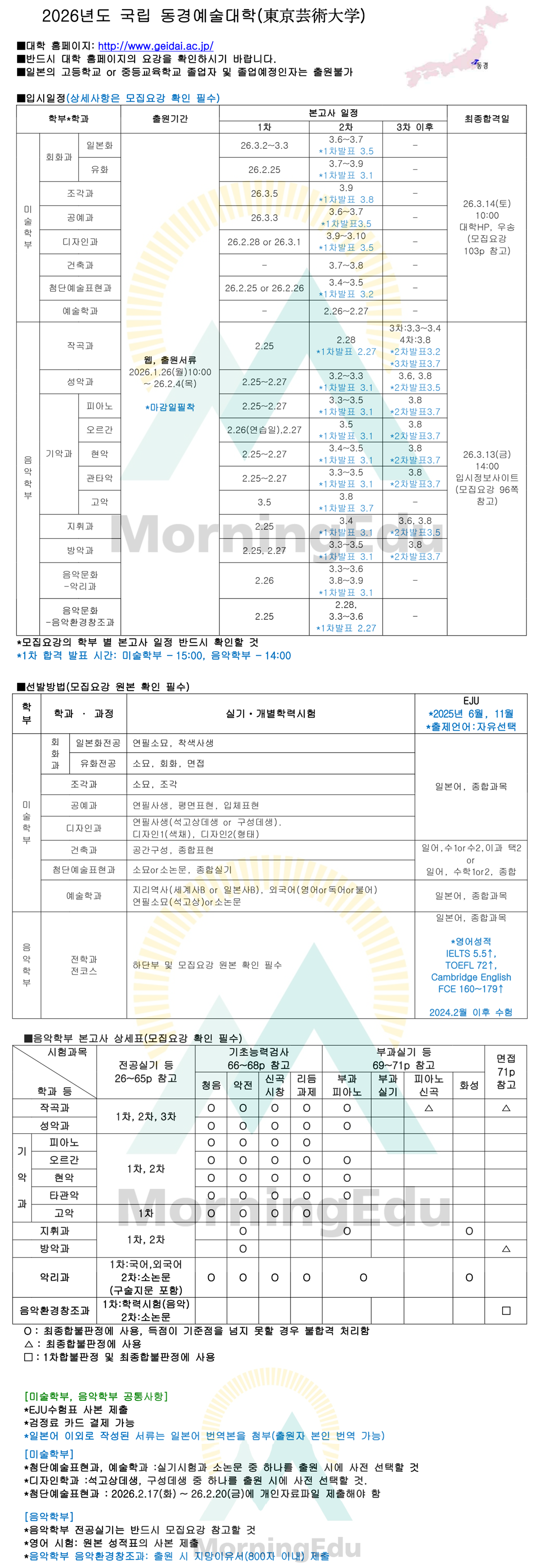 <국립> 2026년도 동경예술대학(東京藝術大学) 작성자모닝에듀(주)|작성시간25.11.30|조회수51 목록 댓글 0 글자크기 작게가 글자크기 크게가 2026 동경예술대학 미술학부 외국인유학생 모집요강 - 251129.pdf2.86MB2026 동경예술대학 음악학부 모집요강 - 251203.pdf6.79MB2026 동경예술대학 음악학부 소정양식 - 251203.pdf874.29KB 첨부파일첨부된 파일이 4개 있습니다. png 파일 2026 동경예술대학(음악학부 공개).png 다운로드 pdf 파일 2026 동경예술대학 음악학부 소정양식 - 251203.pdf 다운로드 pdf 파일 2026 동경예술대학 미술학부 외국인유학생 모집요강 - 251129.pdf 다운로드 pdf 파일 2026 동경예술대학 음악학부 모집요강 - 251203.pdf 다운로드 다음검색 현재 게시글 추가 기능 열기 북마크 신고 센터로 신고 댓글 댓글 0 댓글쓰기 답글쓰기 댓글 리스트