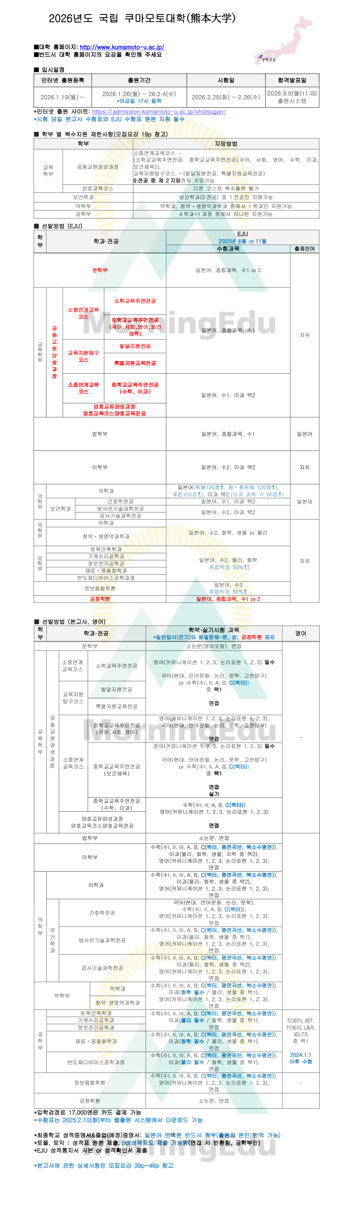 <국립> 2026년도 쿠마모토대학(熊本大学) 작성자모닝에듀(주)|작성시간25.12.03|조회수149 목록 댓글 0 글자크기 작게가 글자크기 크게가 2026 쿠마모토 외국인유학생 모집요강 - 20251127.pdf19.49MB 첨부파일첨부된 파일이 2개 있습니다. pdf 파일 2026 쿠마모토 외국인유학생 모집요강 - 20251127.pdf 다운로드 png 파일 2026 쿠마모토.png 다운로드 다음검색 현재 게시글 추가 기능 열기 북마크 신고 센터로 신고 댓글 댓글 0 댓글쓰기 답글쓰기 댓글 리스트