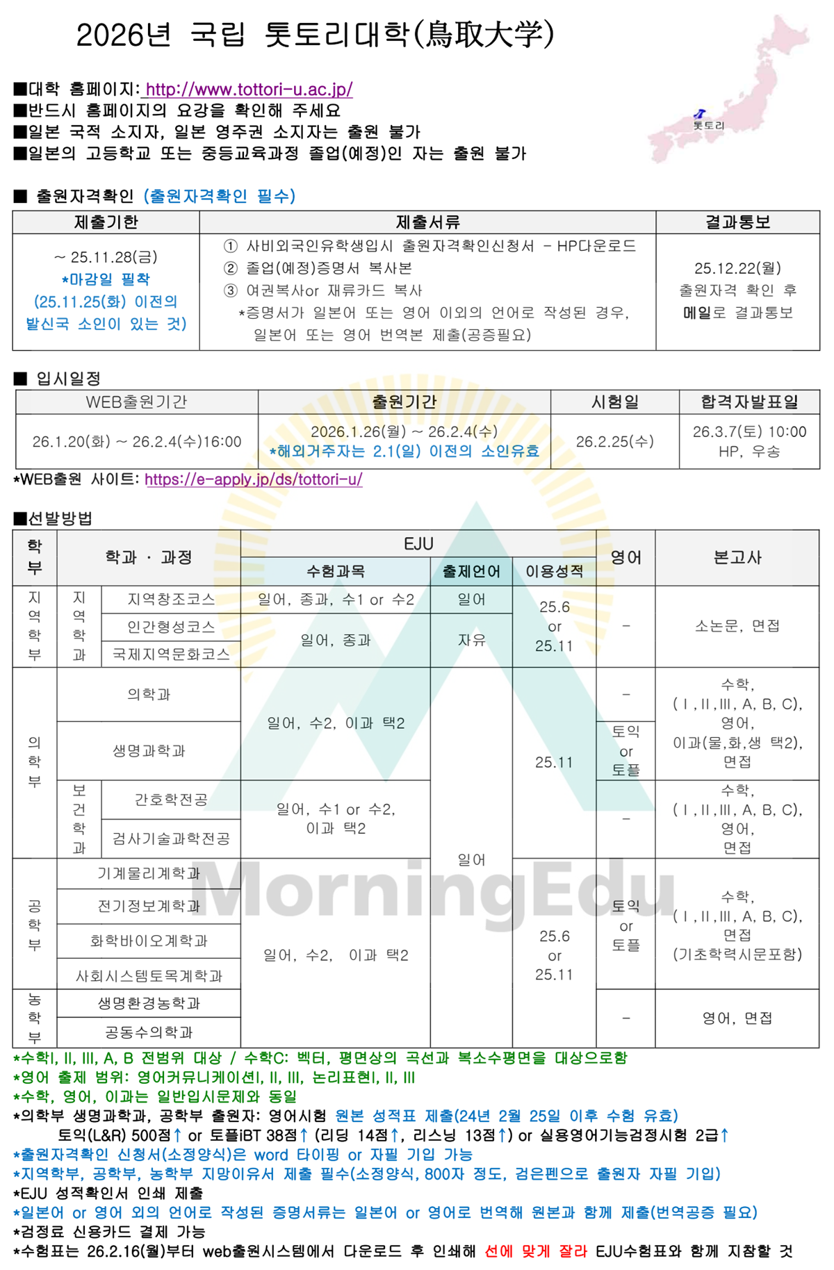 <국립> 2026년도 톳토리대학(鳥取大学) 작성자모닝에듀(주)|작성시간25.12.13|조회수92 목록 댓글 0 글자크기 작게가 글자크기 크게가 2026 톳토리 외국인유학생 모집요강 및 소정양식 - 251210.pdf3.24MB 첨부파일첨부된 파일이 2개 있습니다. png 파일 2026 톳토리대학.png 다운로드 pdf 파일 2026 톳토리 외국인유학생 모집요강 및 소정양식 - 251210.pdf 다운로드 다음검색 현재 게시글 추가 기능 열기 북마크 신고 센터로 신고 댓글 댓글 0 댓글쓰기 답글쓰기 댓글 리스트