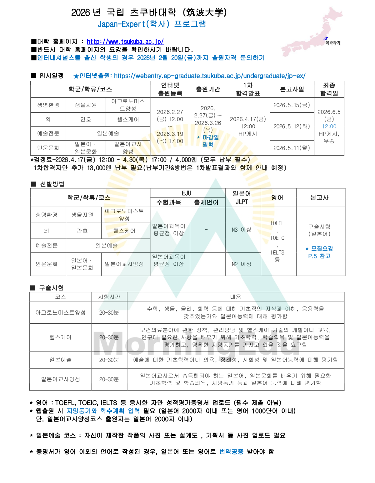 <국립> 2026년도 츠쿠바대학(筑波大学) Japan-Expert프로그램 작성자모닝에듀(주)|작성시간25.12.23|조회수40 목록 댓글 0 글자크기 작게가 글자크기 크게가 2026 츠쿠바 JAPAN EXPERT 프로그램 모집요강 - 20251222.pdf701.18KB2026 츠쿠바 JAPAN EXPERT 프로그램 학교정보폼 - 20251222.pdf170.49KB 첨부파일첨부된 파일이 3개 있습니다. pdf 파일 2026 츠쿠바 JAPAN EXPERT 프로그램 학교정보폼 - 20251222.pdf 다운로드 pdf 파일 2026 츠쿠바 JAPAN EXPERT 프로그램 모집요강 - 20251222.pdf 다운로드 png 파일 2026 츠쿠바대학.png 다운로드 다음검색 현재 게시글 추가 기능 열기 북마크 신고 센터로 신고 댓글 댓글 0 댓글쓰기 답글쓰기 댓글 리스트