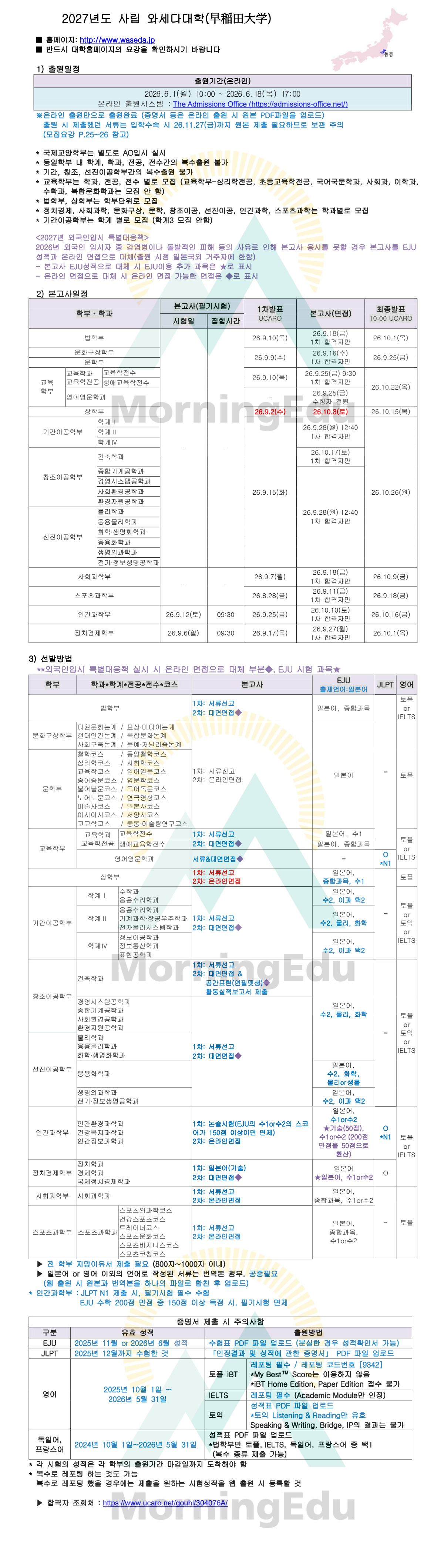 <사립> 2027년도 와세다대학(早稲田大学) 작성자모닝에듀(주)|작성시간26.03.02|조회수110 목록 댓글 0 글자크기 작게가 글자크기 크게가 2027 와세다 외국인유학생 모집요강 - 20260227.pdf2.91MB2027 와세다 외국인유학생 졸업(예정) 증명서 템플릿 - 20260227.pdf239.37KB2027 와세다 외국인유학생 지망이유서(타이핑) - 20260227.docx29.26KB2027 와세다 외국인유학생 특별조치에 대해 - 20260227.pdf444.38KB 첨부파일첨부된 파일이 5개 있습니다. pdf 파일 2027 와세다 외국인유학생 졸업(예정) 증명서 템플릿 - 20260227.pdf 다운로드 docx 파일 2027 와세다 외국인유학생 지망이유서(타이핑) - 20260227.docx 다운로드 pdf 파일 2027 와세다 외국인유학생 특별조치에 대해 - 20260227.pdf 다운로드 pdf 파일 2027 와세다 외국인유학생 모집요강 - 20260227.pdf 다운로드 png 파일 2027 와세다.png 다운로드 다음검색 현재 게시글 추가 기능 열기 북마크 신고 센터로 신고 댓글 댓글 0 댓글쓰기 답글쓰기 댓글 리스트