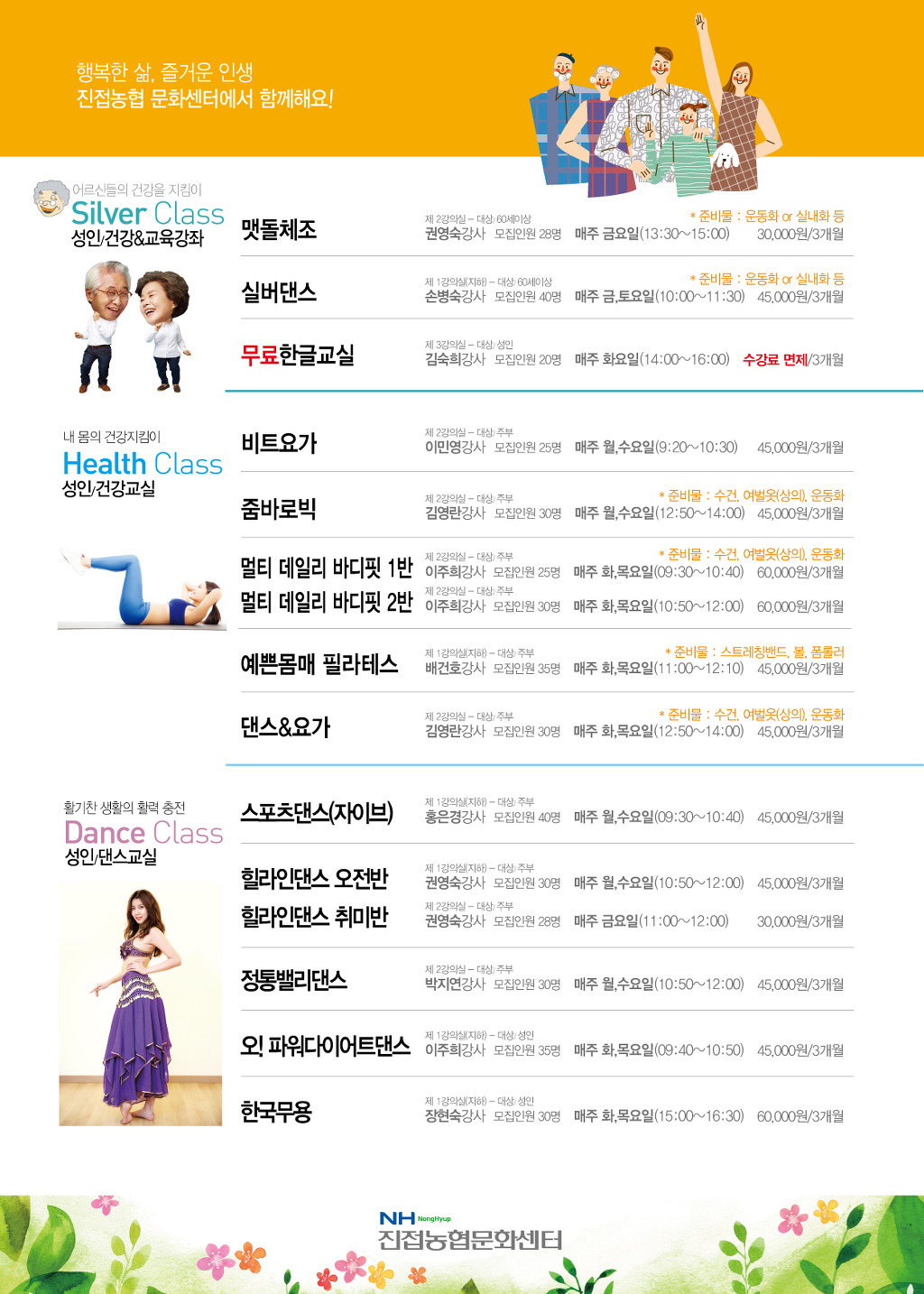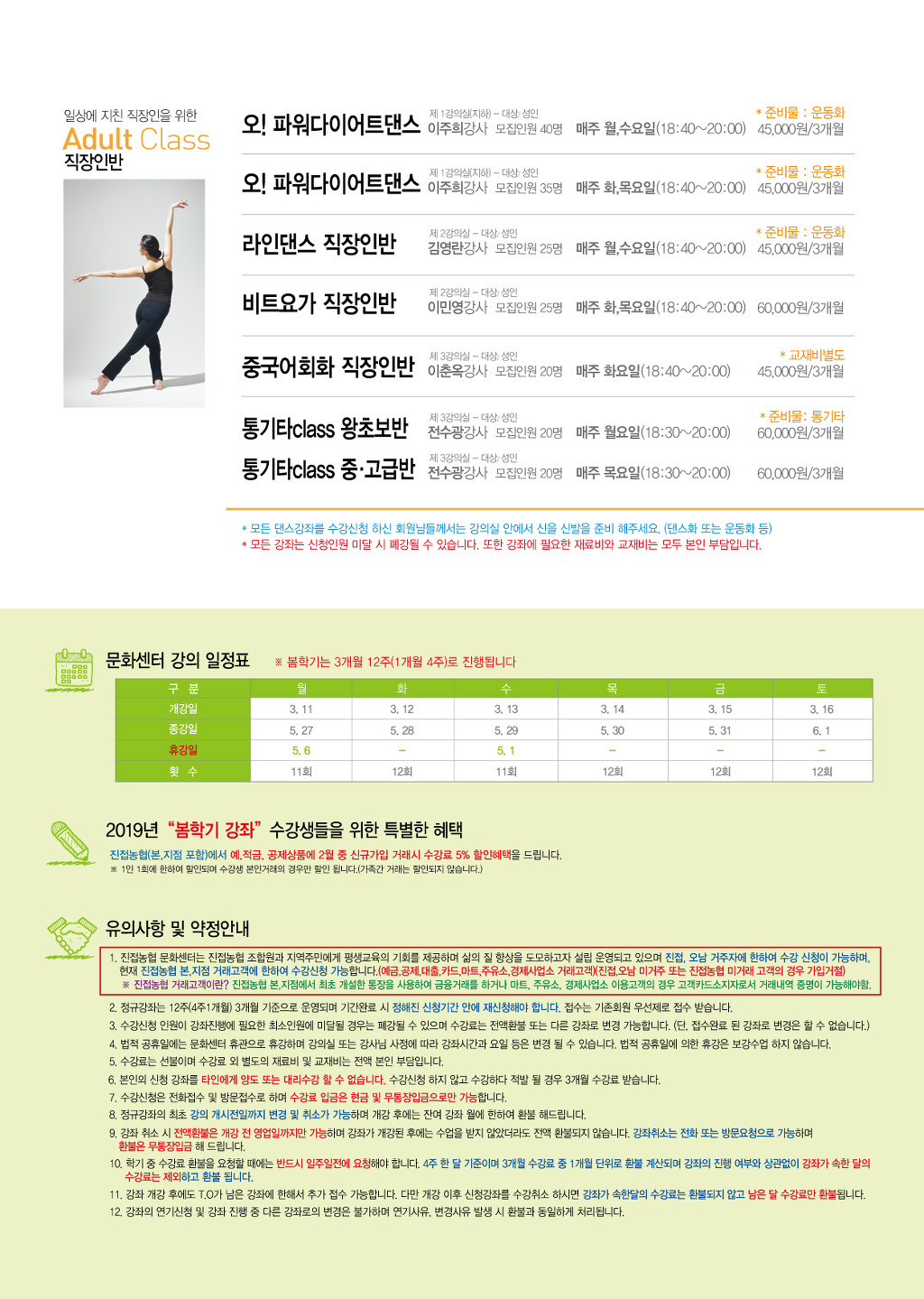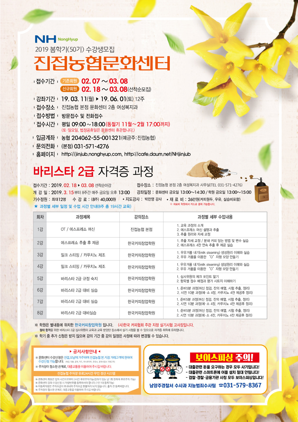 2019 봄학기 본점 회원모집 작성자진접농협문화센터|작성시간19.02.08|조회수782 목록 댓글 2 글자크기 작게가 글자크기 크게가 다음검색 현재 게시글 추가 기능 열기 북마크 공유하기 신고 센터로 신고 댓글 댓글 2 댓글쓰기 답글쓰기 댓글 리스트 작성자깜씨 | 작성시간 19.04.02 연평점은 언제 오픈하는 건가요? 답댓글 작성자진접농협문화센터 작성자 본인 여부 작성자 | 작성시간 19.04.03 공사가 완료되기전까지는 본점에서만 이뤄집니다. 댓글 전체보기