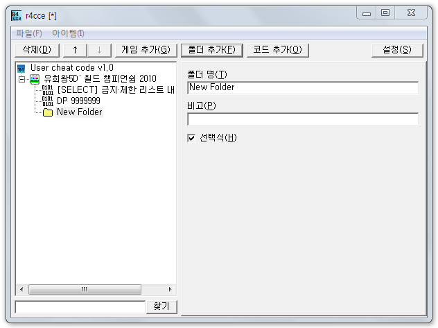 만약 폴더 내의 치트가 하나만 선택하는 것이라면 위의 그림에서 보시면 비고 아래 "선택식"아리는 란을 "체크"하시고,