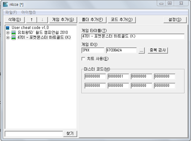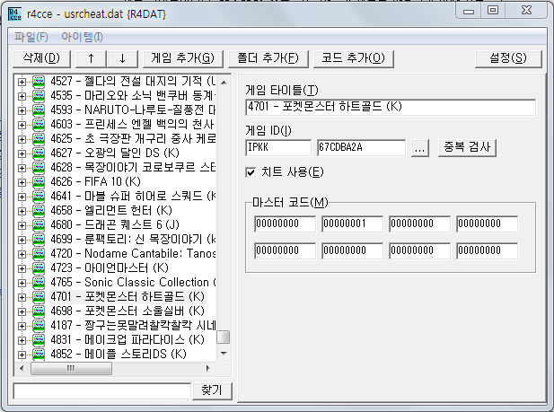 1) 다른 곳에서 구해 온 치트 파일에서 "포켓몬스터 하트골드(K)"만을 위에서 만든 나의 치트 파일에 합쳐 보겠습니다.
