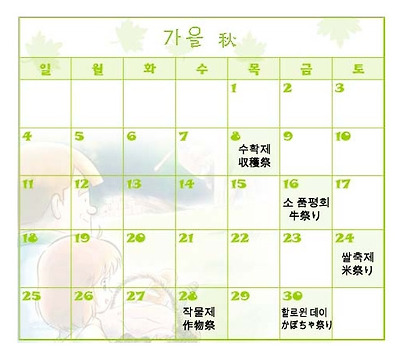 가을의 30일 할로윈데이 집에 온 아이들에게 과자를 주어 돌려보내는 축제입니다. 일정 시간대에 집에 들어가면 아이들이 과자를 받으러 옵니다. 결혼하고 난 후에는 오후 3시 이후에 집에 들어가면 이벤트가 일어납니다.