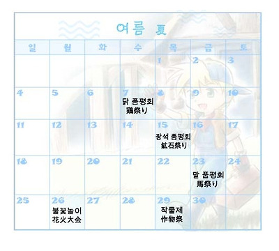 겨울의 4일 눈꽃축제 雪祭り 눈사람을 만드는 축제입니다. 오전 10시부터 초원에서 개최합니다. 여러명에게 눈사람을 만들자고 권유할 수 있으며 거절당하면 아무도 권유할 수 없게 되며 고란과 단 둘이서 만들어야 합니다. 모든 신부, 신랑가 갖추어 지지 않으면 발생하지 않는다는 말도 있습니다.