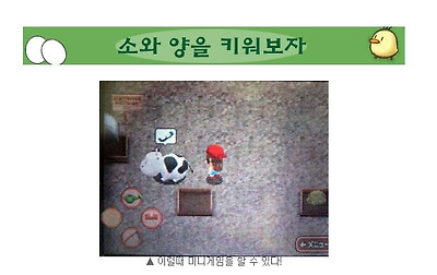 쓰다듬어 주기와 소에게는 우유짜기, 양에게는 털깎기(?)가 있습니다. 소의 우유짜기 미니게임같은 경우 처음 익숙하지 않을때는 시간이 충분하니, 계속 M만 노려도 S급을 받을 수 있습니다. 양의 미니게임에서는 그냥 사방팔방으로 돌아다니는 양을 재빨리 그리고 최대한 여러번 터치해주시면 됩니다. 미니게임을 하면 평소보다 높은 등급의 우유와 양털을 얻을 수 있습니다.