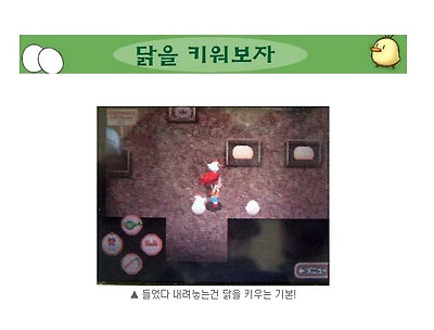 Q. 닭을 돌 안에서 방목시키려면 목장 안에서 돌을 쌓아서 해야 하나요? 넓게 안잡아도 닭들이 알아서 밥 먹나요? A. 닭을 방목시킬땐 사각형으로 울타리를 만들어서 그 안에 집어넣으면 닭이 모이를 알아서 찾아, 주어 먹습니다. 작게 만들어도 상관없을것 같구요 캐릭터까지 들어갈수 있을정도로만 만들면 되겠네요. 그리고 방목시키실땐 들개나 날씨에 충분히 주의를 기울여야 합니다.