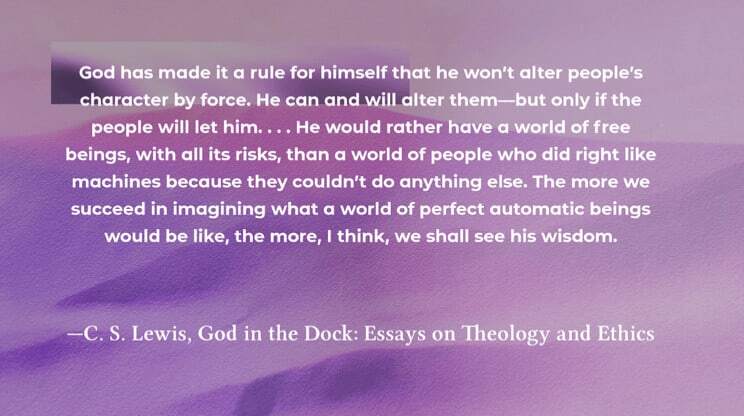 God has made it a rule for himself that he won’t alter people’s character by force. He can and will alter them—but only if the people will let him. . . . He would rather have a world of free beings, with all its risks, than a world of people who did right like machines because they couldn’t do anything else. The more we succeed in imagining what a world of perfect automatic beings would be like, the more, I think, we shall see his wisdom. —C. S. Lewis, God in the Dock: Essays on Theology and Ethics