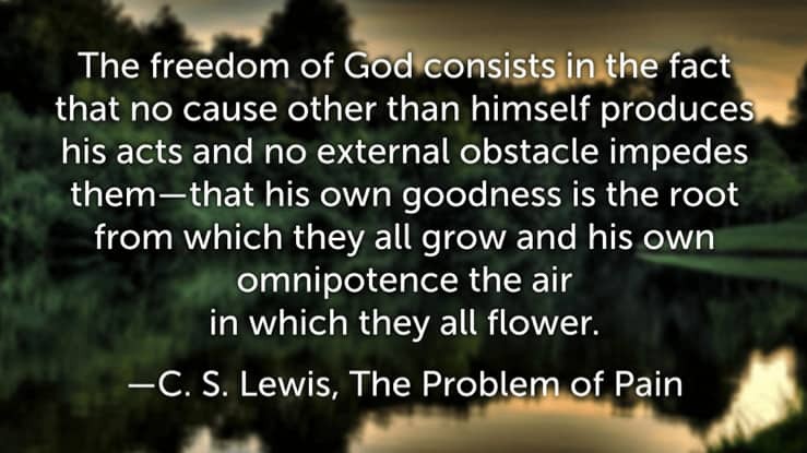 The freedom of God consists in the fact that no cause other than himself produces his acts and no external obstacle impedes them—that his own goodness is the root from which they all grow and his own omnipotence the air in which they all flower. —C. S. Lewis, The Problem of Pain