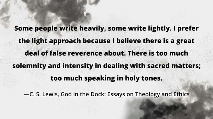 Some people write heavily, some write lightly. I prefer the light approach because I believe there is a great deal of false reverence about. There is too much solemnity and intensity in dealing with sacred matters; too much speaking in holy tones. —C. S. Lewis, God in the Dock: Essays on Theology and Ethics