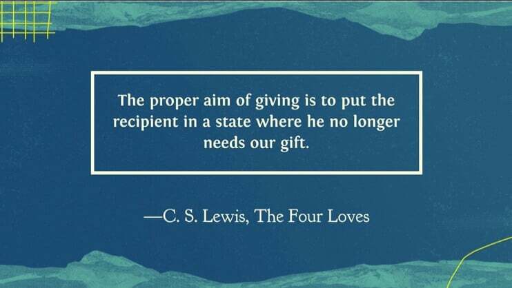 The proper aim of giving is to put the recipient in a state where he no longer needs our gift. —C. S. Lewis, The Four Loves