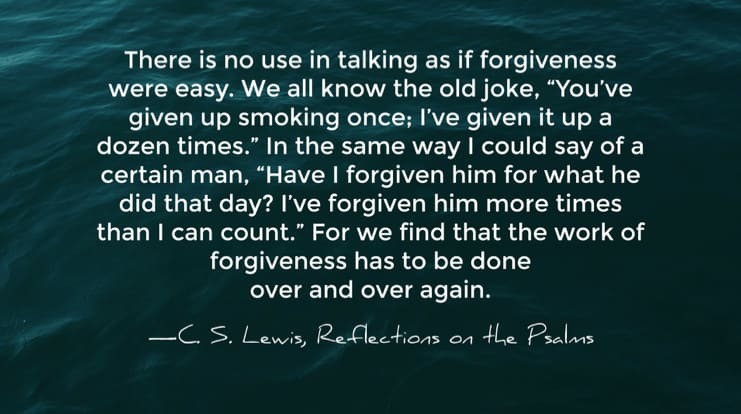 There is no use in talking as if forgiveness were easy. We all know the old joke, “You’ve given up smoking once; I’ve given it up a dozen times.” In the same way I could say of a certain man, “Have I forgiven him for what he did that day? I’ve forgiven him more times than I can count.” For we find that the work of forgiveness has to be done over and over again. —C. S. Lewis, Reflections on the Psalms