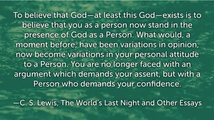 To believe that God—at least this God—exists is to believe that you as a person now stand in the presence of God as a Person. What would, a moment before, have been variations in opinion, now become variations in your personal attitude to a Person. You are no longer faced with an argument which demands your assent, but with a Person who demands your confidence. —C. S. Lewis, The World’s Last Night and Other Essays