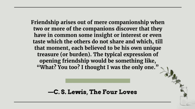 Friendship arises out of mere companionship when two or more of the companions discover that they have in common some insight or interest or even taste which the others do not share and which, till that moment, each believed to be his own unique treasure (or burden). The typical expression of opening friendship would be something like, “What? You too? I thought I was the only one.” —C. S. Lewis, The Four Loves