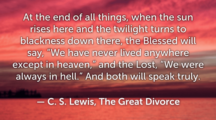 At the end of all things, when the sun rises here and the twilight turns to blackness down there, the Blessed will say, “We have never lived anywhere except in heaven,” and the Lost, “We were always in hell.” And both will speak truly. —C. S. Lewis, The Great Divorce