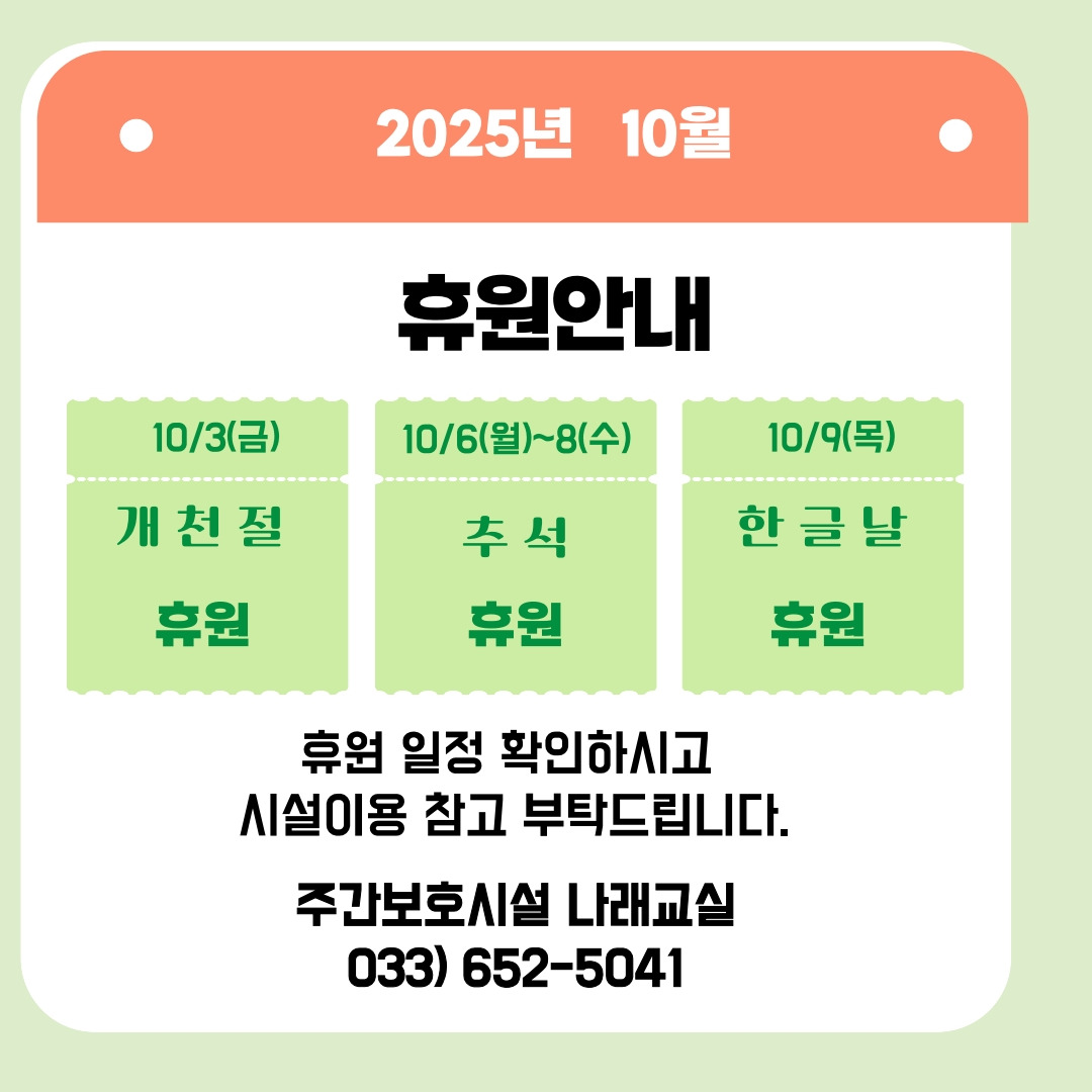 10월 휴원공지 작성자노랑노란이|작성시간25.09.25|조회수73 목록 댓글 0 글자크기 작게가 글자크기 크게가 다음검색 현재 게시글 추가 기능 열기 북마크 신고 센터로 신고 댓글 댓글 0 댓글쓰기 답글쓰기 댓글 리스트