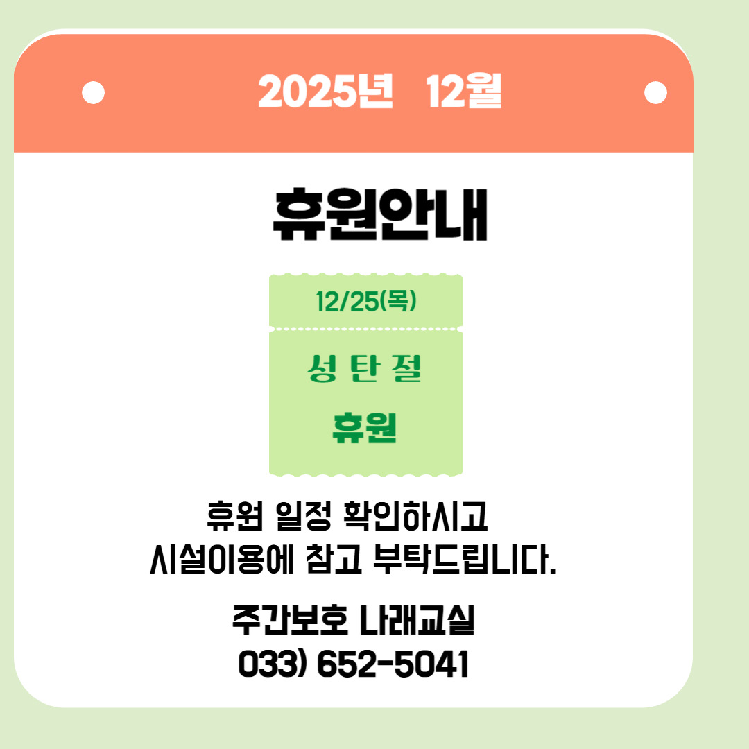 12월 휴원공지 작성자노랑노란이|작성시간25.11.26|조회수50 목록 댓글 0 글자크기 작게가 글자크기 크게가 다음검색 현재 게시글 추가 기능 열기 북마크 신고 센터로 신고 댓글 댓글 0 댓글쓰기 답글쓰기 댓글 리스트