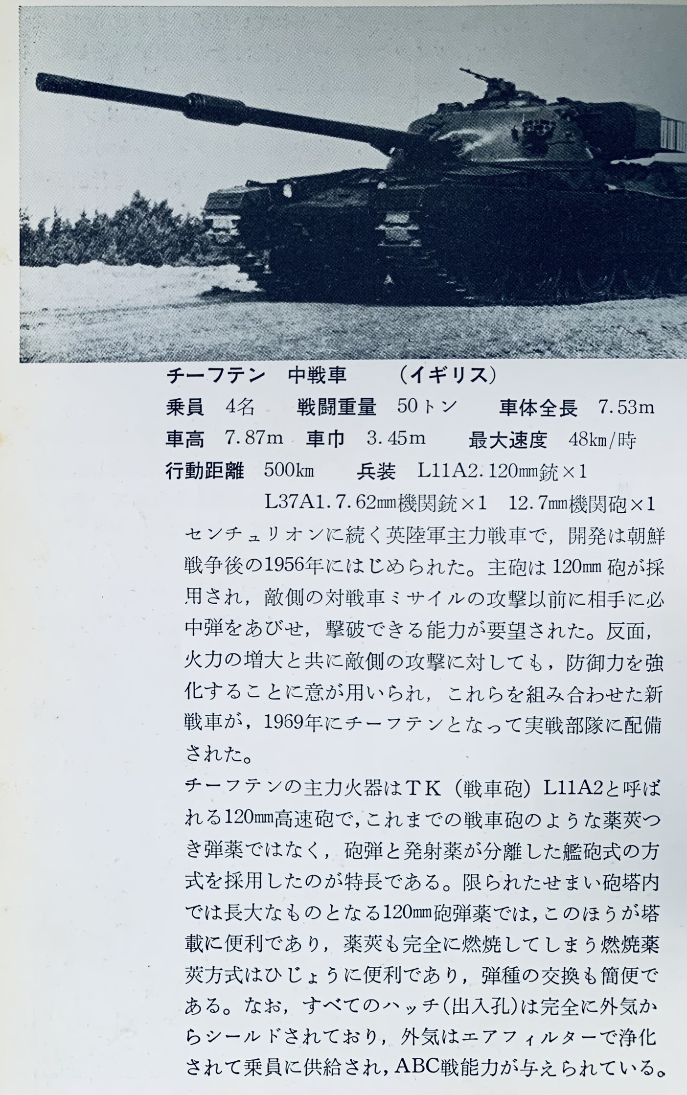 1975년 책 '최신병기도감'의 치프틴 전차 항목에 나오는 설명인데 "주포는 120 mm 포가 채용되어 적의 대전차 미사일의 공격 이전에 상대에게 필중탄을 쏘고 격파할 수 있는 능력이 요망되었다"라는 처음 듣는 얘기가 써 있네요.