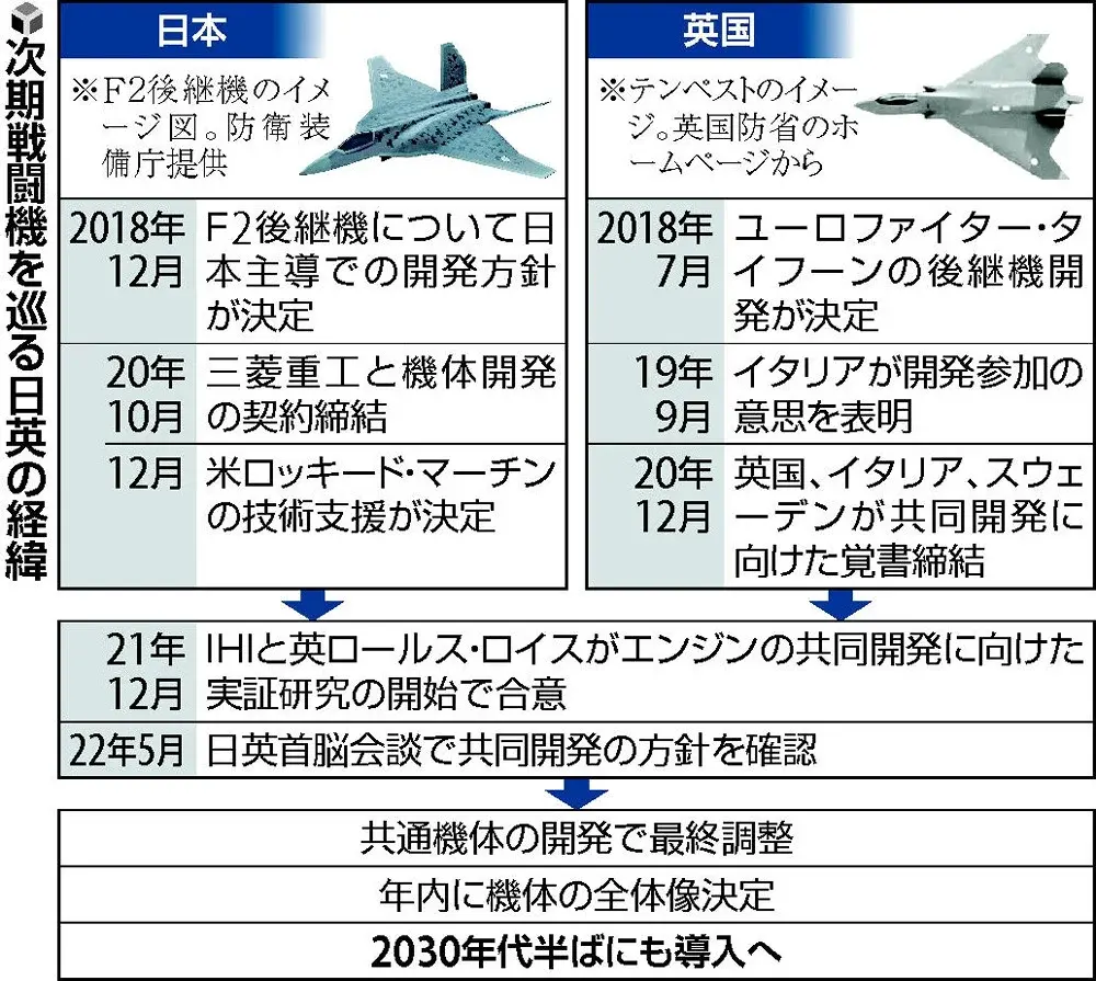 日本は次期戦闘機について、F2戦闘機の退役が始まる30年代半ばに導入する方針だ。ステルス性能や高性能レーダー、センサーを備え、多数の無人機と連携して戦闘できる機体を目指している。米ロッキード・マーチンの支援を受ける方向だったが、調整が難航し、日英共同開発に切り替えた経緯がある。