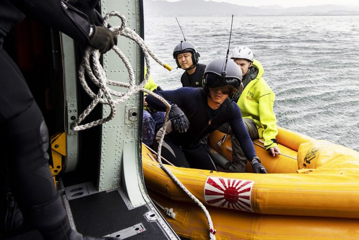 JMSDF personnel demonstrating search and rescue techniques to U.S. personnel on board an inflatable motorboat launched from a US-2 in the Pacific Ocean on June 26, 2024, showcasing the aircraft’s unique air sea rescue capabilities. (Image credit: U.S. Marine Corps photo by Cpl. Chloe Johnson)